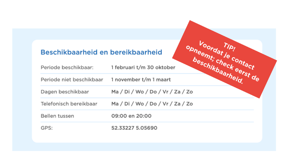 Voordat je een Logeeradres belt of een mail stuurt: check eerst even de beschikbaarheid én de tijden waarop je kunt bellen. Dat is voor jou én het Logeeradres wel zo prettig.