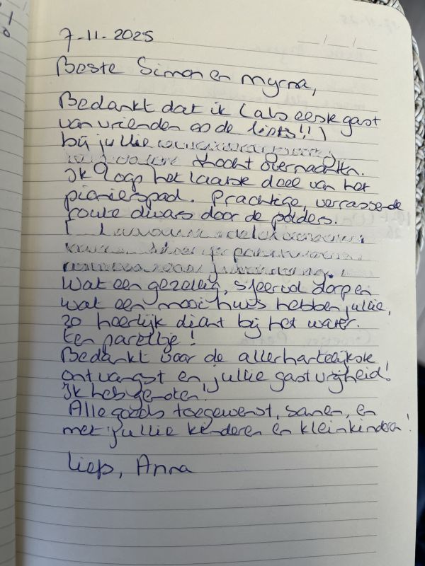 "Het mag eigenlijk niet, ik weet 't, maar een Belgisch echtpaar belde. Al 30 jaar Vriend. Ze wilden bij hoge uitzondering twee nachten omdat ze vanuit mijn huis twee mooie routes hadden gevonden voor twee hele dagen fietsen. Normaal ben ik van: op tijd ontbijten en dan op een vriendelijke manier wieberen, maar nu dacht ik: wat een mooie mensen, die gin ik een tweede nacht."